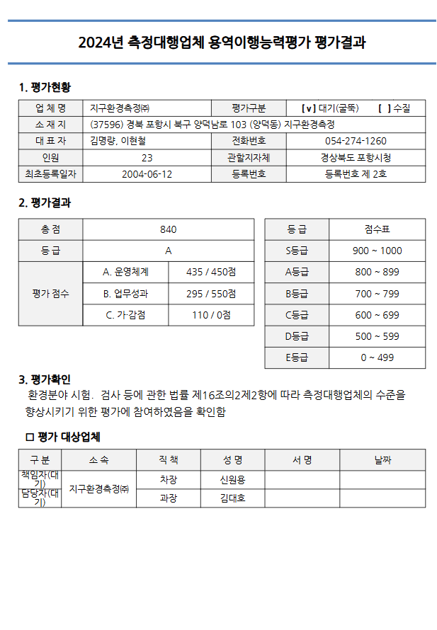 2024년도 측정대행업체 용역이행능력평가결과 A등급을 받았습니다.